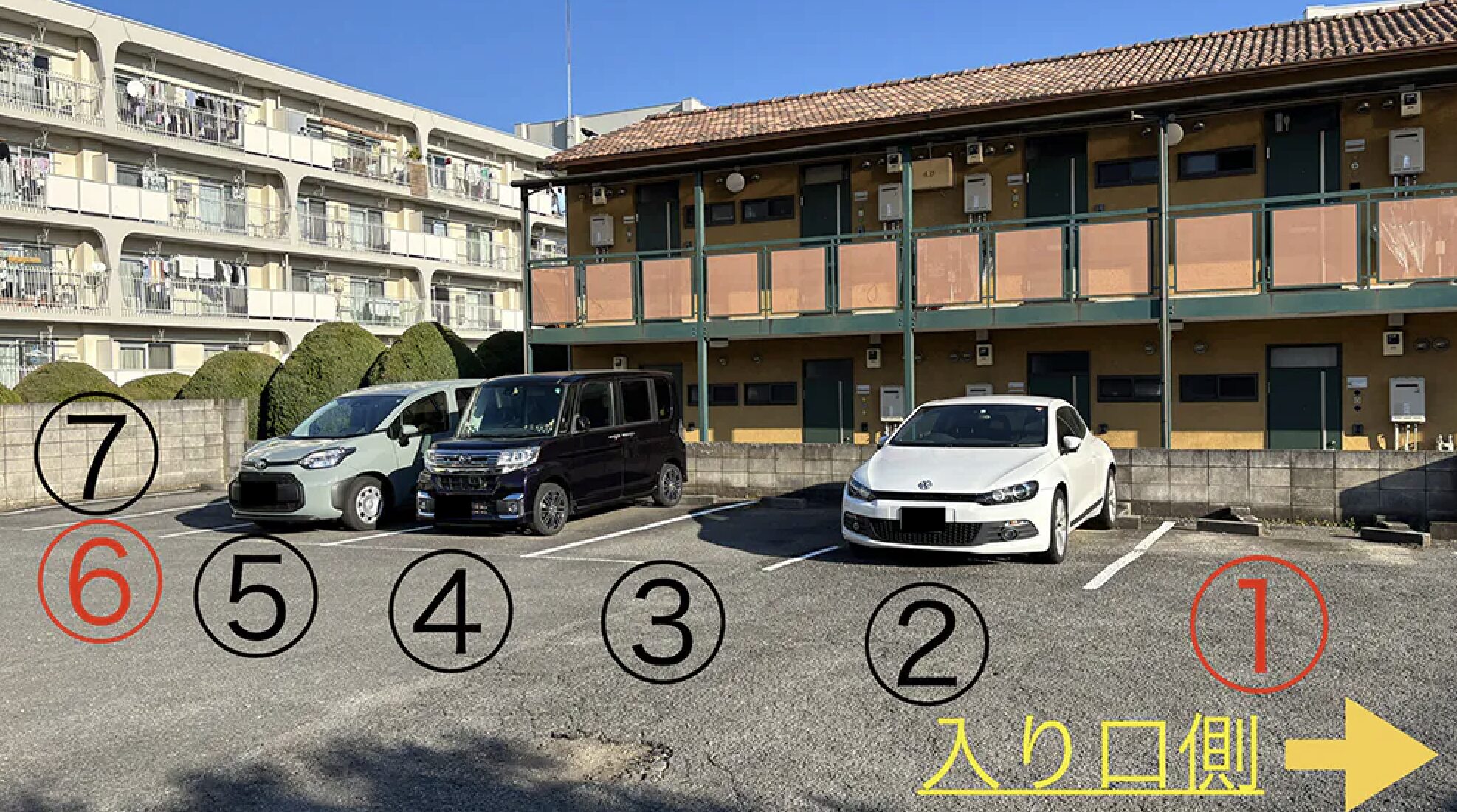⑥細道を抜けた先の駐車場内No.1・No.6。